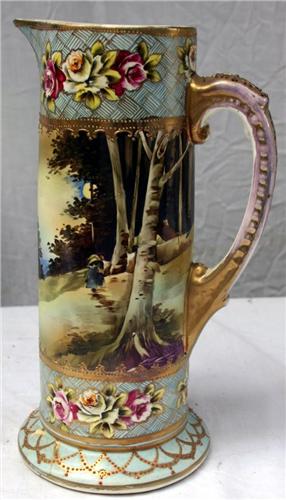 Nippon pitcher, hand-painted woodland scene. Upper and lower 2" floral border. Repaired crack.. Approximately 12" H.