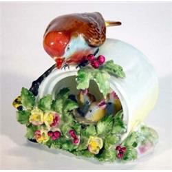 Hand painted Royal Adderleys robin on a tin can feeding young, marks to base, 10cm high…