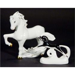 Hand painted Russian prancing horse and an Art Deco style USSR horse, marks to bases, largest 17cm high