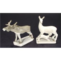 Hand painted USSR moose and a mother deer and baby, marks to bases, largest 17cm high