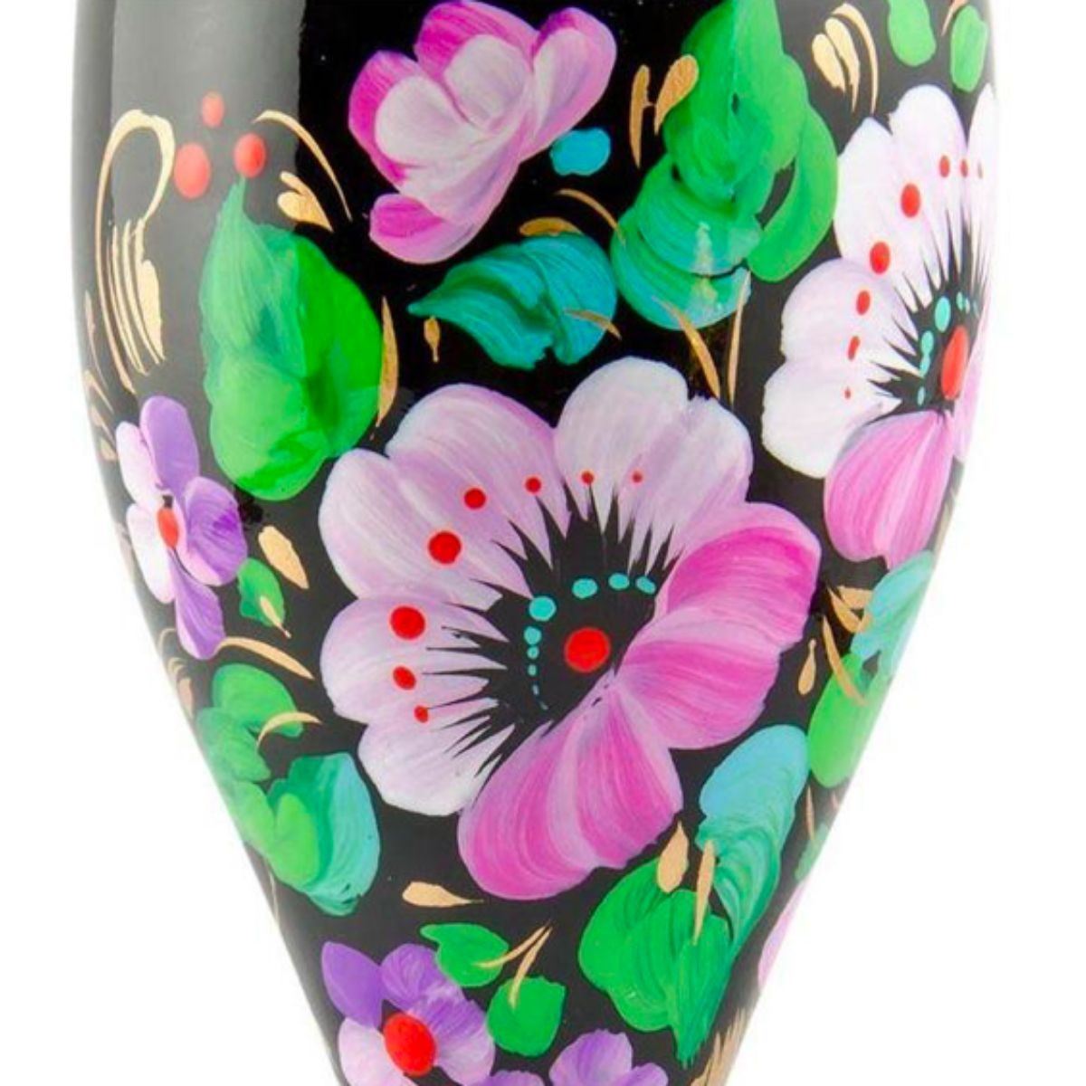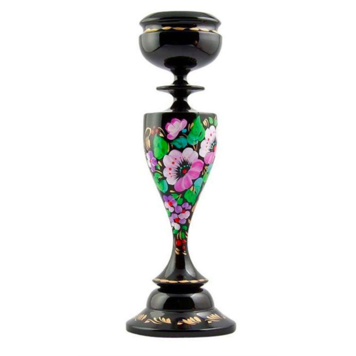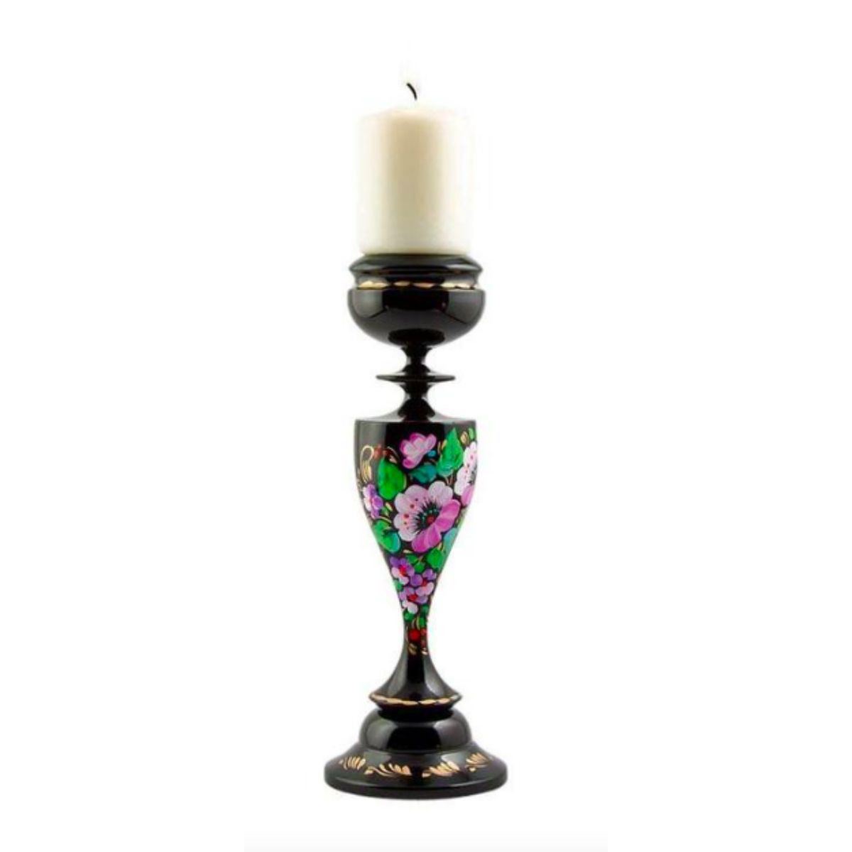 Hand crafted out of Linden tree wood by Ukrainian artisan, ebonized with gilt trim, centerpiece candle holder. Hand-painted purple floral design with high gloss varnish. 7" H.Â