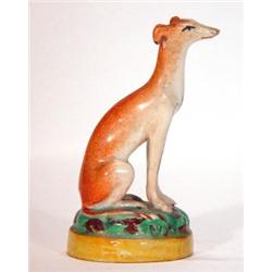 Hand painted Victorian Staffordshire seated greyhound on a circular base, 11cm high