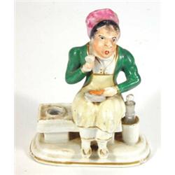 Hand painted Victorian porcelaineous Staffordshire figure of a gentleman in a green jacket stuffing his face seated on an inkwell base, 10cm high