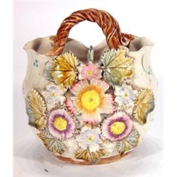 Hand painted Victorian pottery floral basket with ropetwist handle, 16cm high