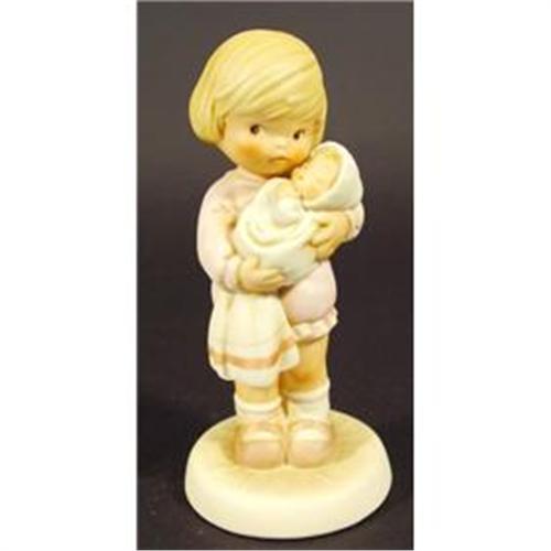 Hand painted bisque Mabel Lucie Attwell figurine, 'Can I keep her, Mommy?', printed factory mark to the base, 13cm high