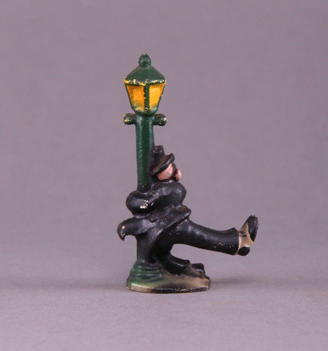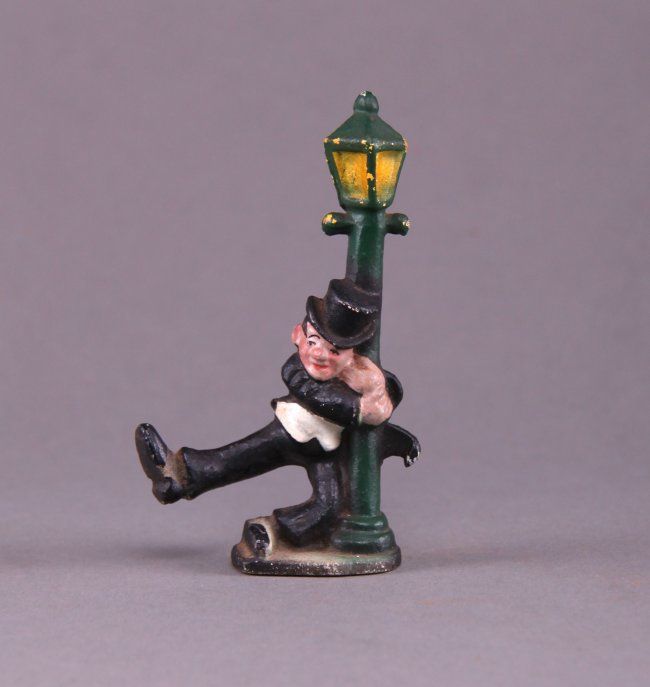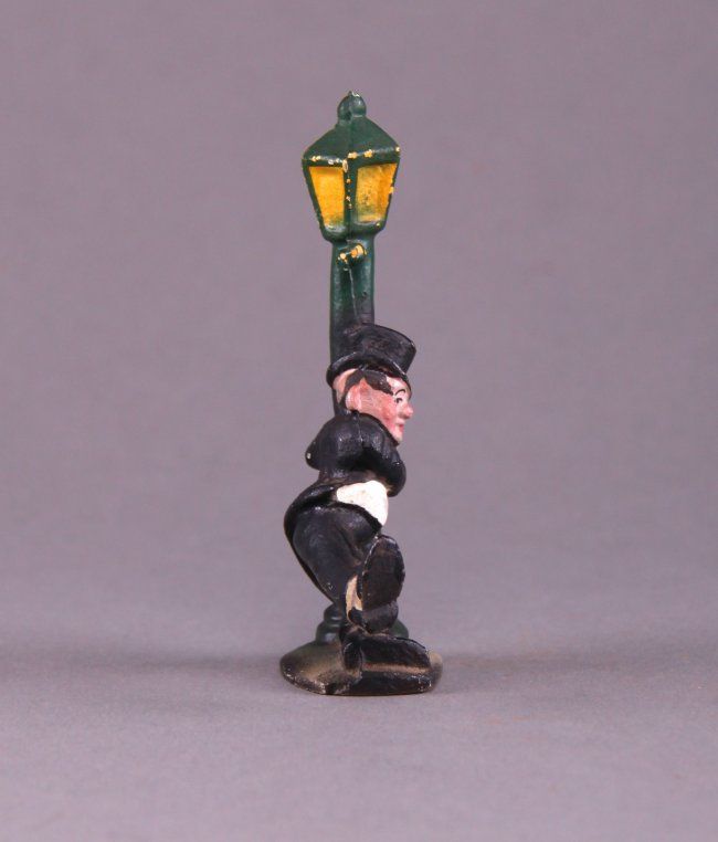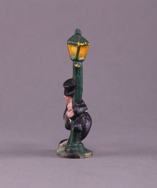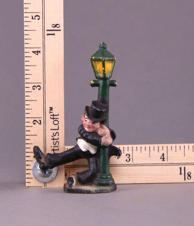 Hand painted cast iron figurine of man swinging on lamp post. (Size: See last photo for measurement.) Photos are part of the description representing the condition report. Pangaea Auctions urges Bidder's to view all attached photos.