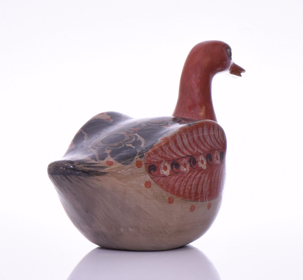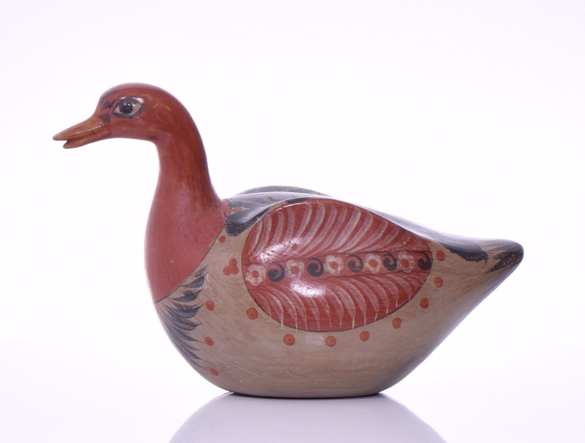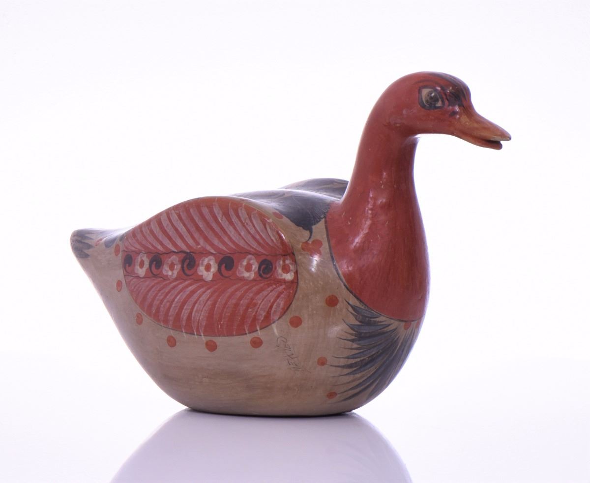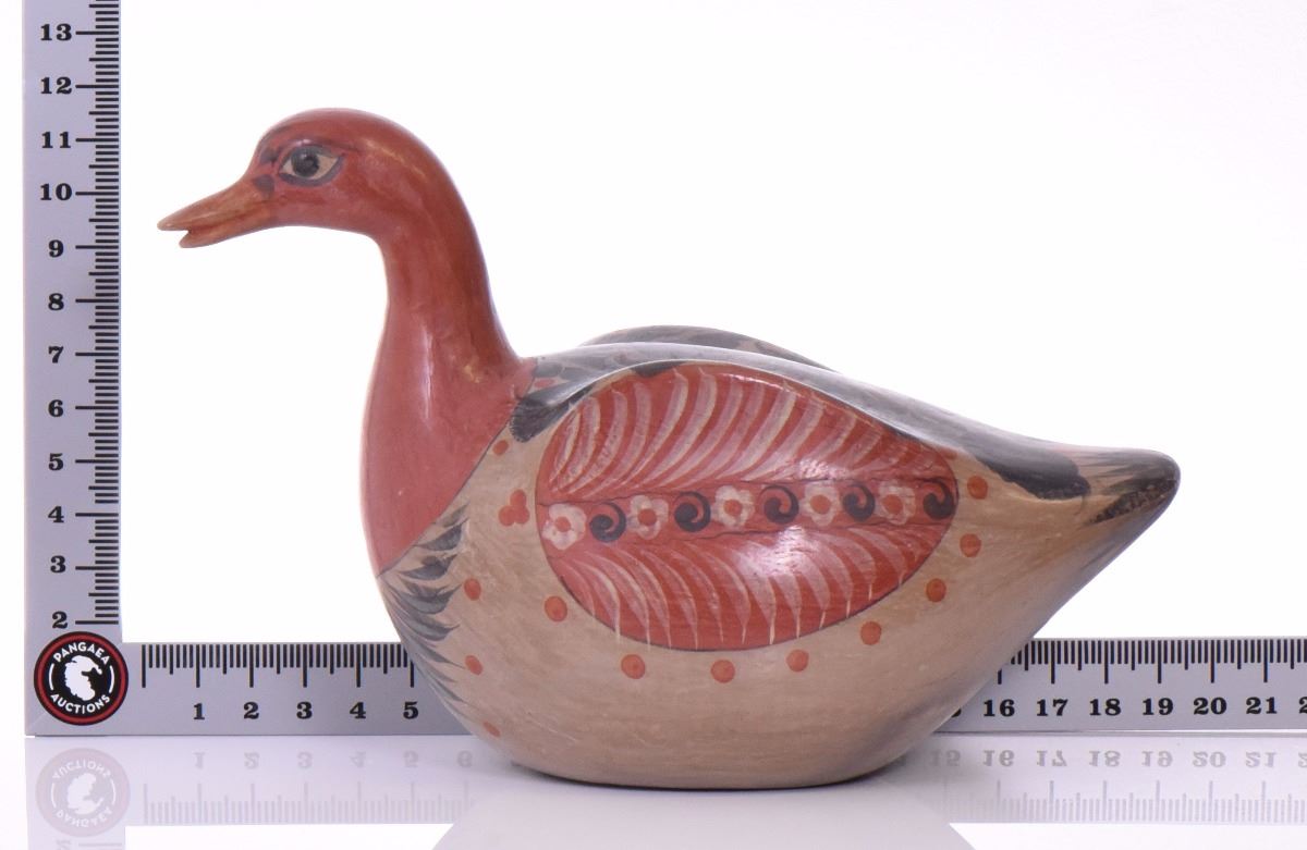 Hand painted ceramic duck, Mexico. Estimated more than 50 yrs old. Mexican art consists of various visual arts filled most of the times with intricate patterns. Mesoamerican art was produced in an area central and southern Mexico before the Spanish conquest of the Aztec Empire for a period of about 3,000 years. During this time, all influences on art production were indigenous, with art heavily tied to religion and the ruling class. The Spanish conquest led to 300 years of Spanish colonial rule where most art was associated with the construction and decoration of churches. Almost all art produced was in the European tradition, with late colonial era artists trained at the Academy of San Carlos. After Independence, art remained heavily European in style, but indigenous themes appeared in major works as liberal Mexico sought to distinguish itself from its Spanish colonial past. This preference for indigenous elements continued into the first half of the 20th century, with the Social Realism or Mexican muralist movement. The strength of this artistic movement was such that it affected newly invented technologies, such as still photography and cinema, and strongly promoted popular arts and crafts as part of Mexico’s identity. Since the 1950s, Mexican art has broken away from the muralist style and has been more globalized, integrating elements from Asia, with Mexican artists and filmmakers having an effect on the global stage. (Wikipedia) Size: See Ruler Photo. (Photos Represent The Condition Of The Lot.)