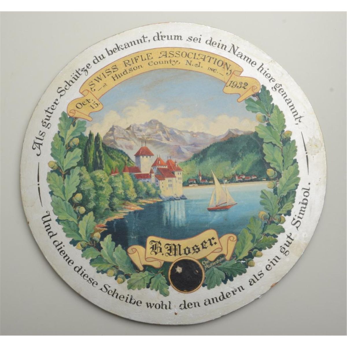 Hand painted on wood German Shutzen Club target for air gun dated Oct. 15, 1932 Swiss Rifle Assoc., Hudson Co., New Jersey. 14-3/4" across center. Marked B. Moser and signed Chr. Mullen Stein (Artist?). KeithCoulter Estate. Good condition. 1 shot in target area. Est.: $100 - $300