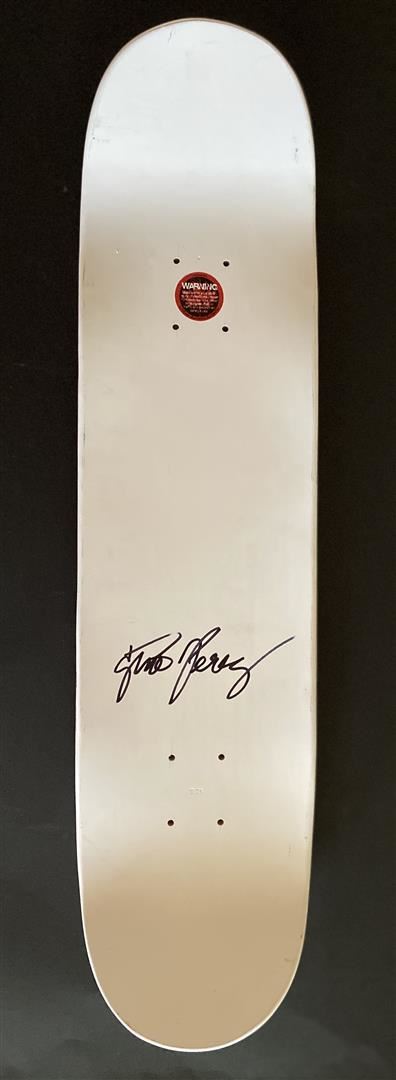 Head Thoughts by Gino Perez. "Head Thoughts" is a wood Sugar Skate Co deck, with hand painted original artwork by Gino Perez, and hand signed. Measures approximately 31.5" x 7.75". Year: 2019. Never mounted or displayed.