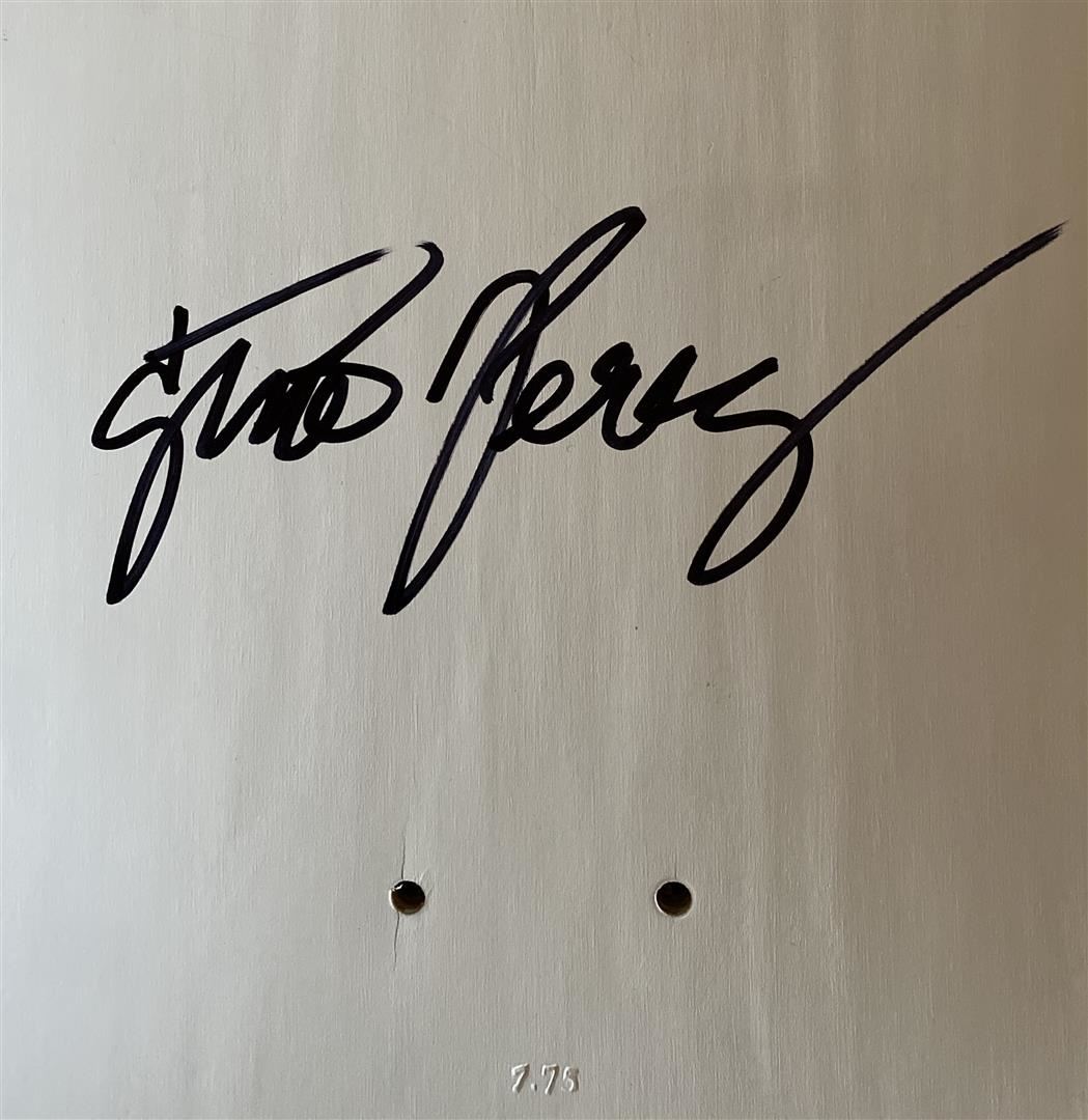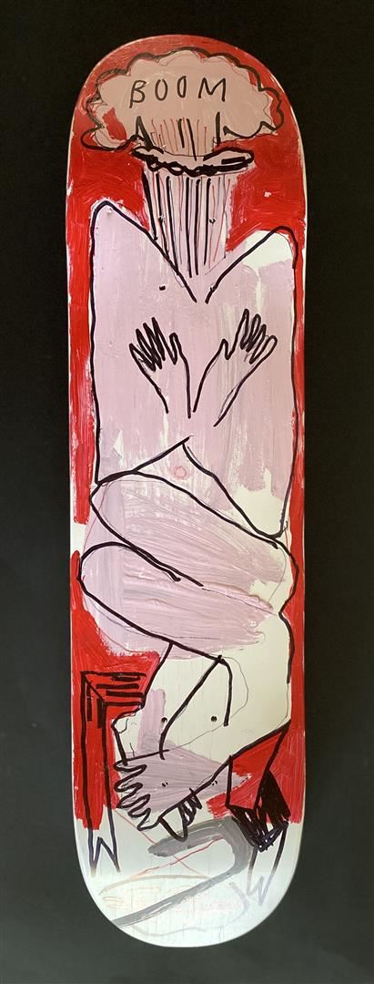 Head Thoughts by Gino Perez. "Head Thoughts" is a wood Sugar Skate Co deck, with hand painted original artwork by Gino Perez, and hand signed. Measures approximately 31.5" x 7.75". Year: 2019. Never mounted or displayed.