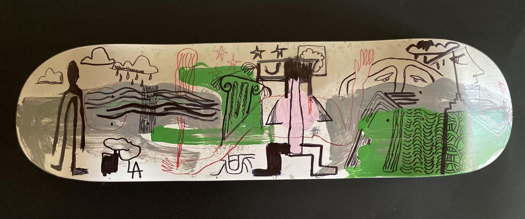 LA Raised by Gino Perez. "LA Raised" is a wood Sugar Skate Co deck, with hand painted original artwork by Gino Perez, and hand signed. Measures approximately 32" x 8.5". Year 2019. Never mounted or displayed.
