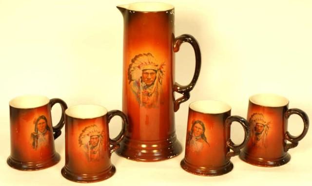 with portraits of Indian Chiefs by Goodwin with some paint flaking. Tankard is 13" X 8".