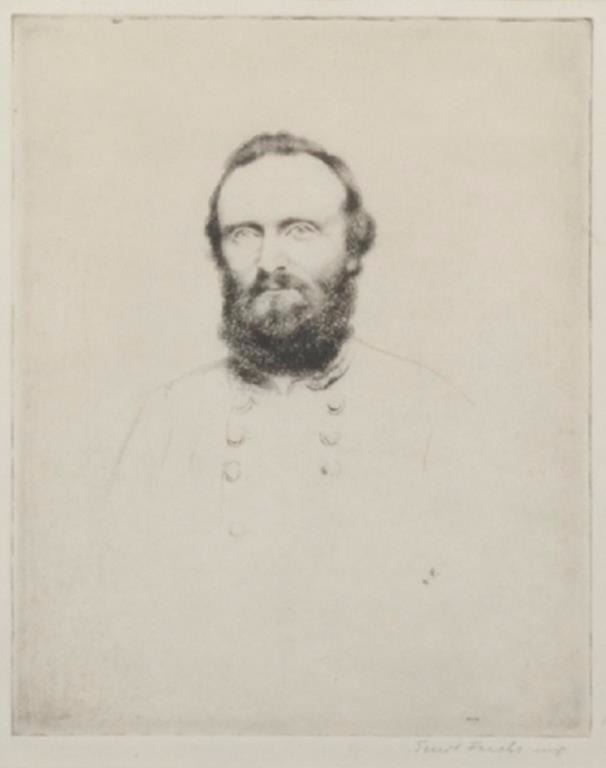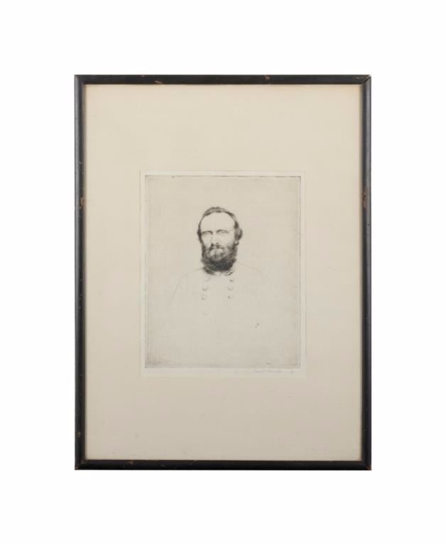 Hand pulled early etching of Gen. Stonewall Jackson in uniform signed in pencil lower right “Emil Fuchs” who was born in Vienna in 1886. The artwork measures 9 ¾” x 7 ¾” and is in an old frame and mat. The condition isgood with normal aging. The collection of William A. Gary consigned by his estate. Est.: $500-$1000
