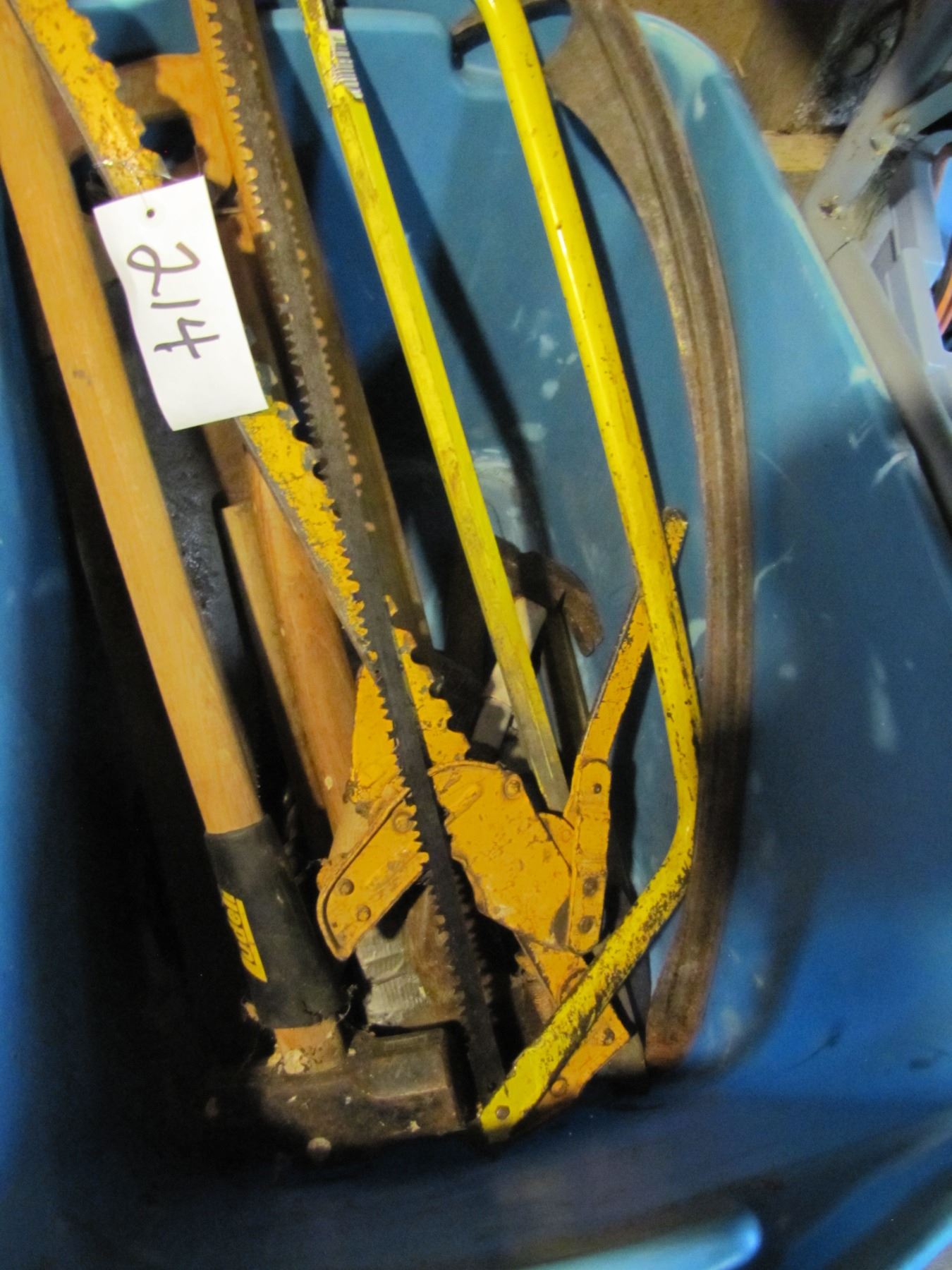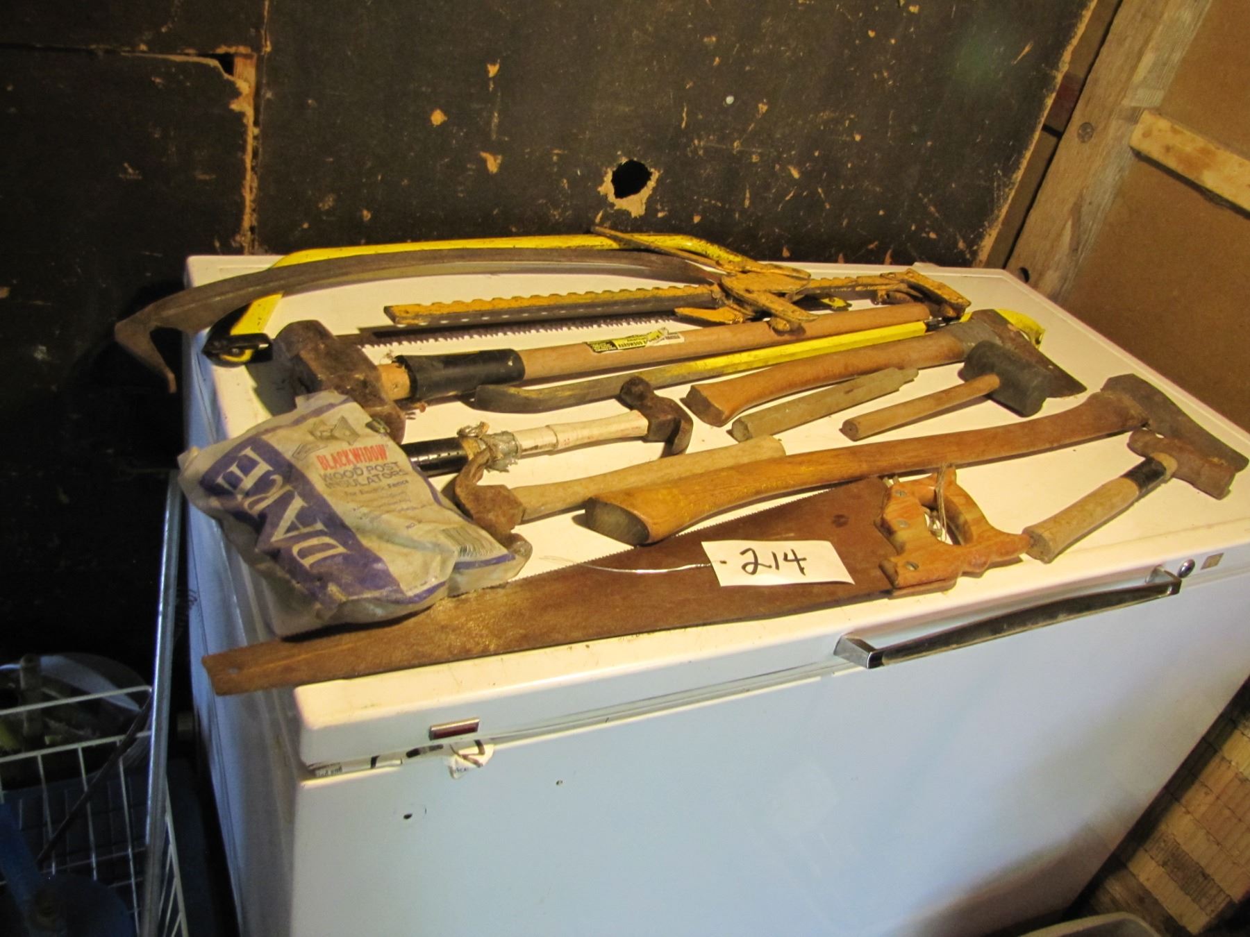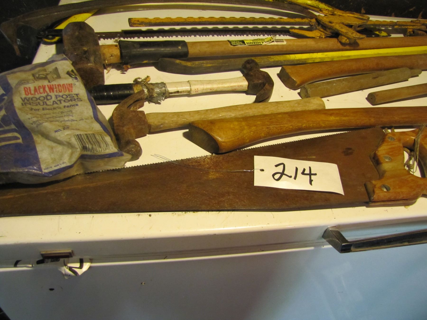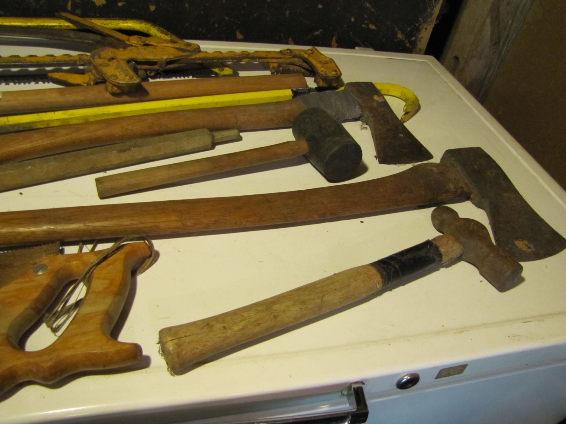 Hand saws, sledgehammer, axes, hammers, fence tightener