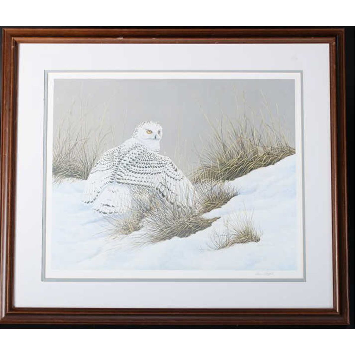 Hand-signed print by Dave Chapple showing snow owl, #124 of 950. Approx 19-1/2” by 24”. Framed and matted. From the Robert Petersen Collection. Est: $100 - $200
