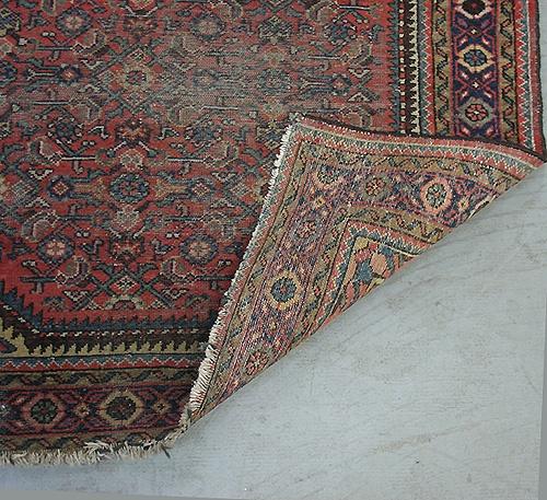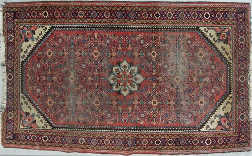 Hand tied Oriental rug; geometric and floral design on red ground with center medallion; early 20th C.; measures 5' 4" x 3' 8" (some wear)