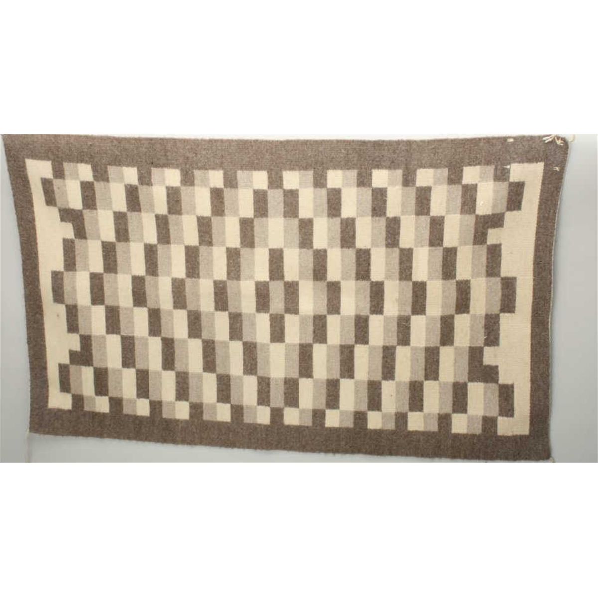 Hand woven Navajo rug, approx. 46-1/2”l by 28”w. Consignor information indicates Mayassie. Rug is circa approx. 1960’s-70’s and shows a three-color geometric pattern in beige, crème, and brown. Very good plus tonear fine condition, some very slight staining, just a little normal aging. Est: $250 - $500