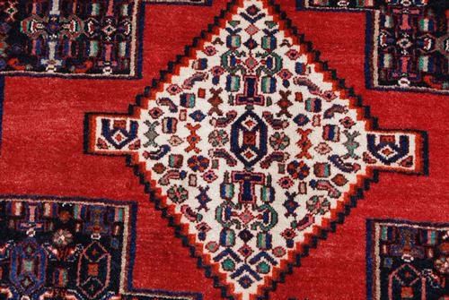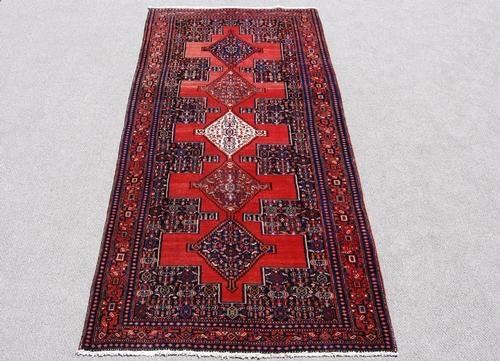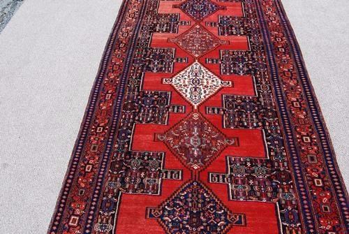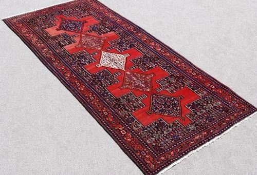 Hand woven mesmerizing design semi antique Persian Senneh Runner. Made of fine quality lamb's wool pile on cotton foundation, all natural vegetable dye. This Runner has a very interesting design, in that it captivates you with its design pattern with five central geometric medallions. Hand woven in City of Senneh from Iran. Size: 4 feet 8 inches X 10 feet 4 inches.