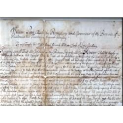 Hand written commission from William Penn "Governour of the Province of Pensilvania and Territorys" to William Clark to collect quitrents in Kent and Sussex Counties in Delaware, dated 1702 and signed Wm. Penn, with red seal, measures 11 1/4" x 14 3/4", under glass frame Estimate 5000/7000