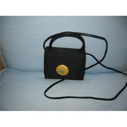 This gorgeous black hand bag is from Italy exclusive for Bloomingdales stores. The vintage pin on the bag is for decoration only. The exterior is of textured black fabric, with black fabric interior. On the label indicates U.S. Pat trade mark. The snap closure is of silvertone metal. This handbag is in excellent condition. It also has extra long handle of black leather. With two buttons detachable.The hard handle is of Textured Fabric in round shape. Long handle is 26 inch. The purse is 6 inch wide, 2 inch deep on each sides. Something to think about!