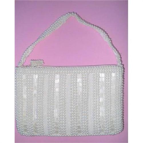 Alternating vertical "ribbons" of pearl color beads, seed beads and shimmery opalescent glass bugle beads on the front and all Pearl color beads on the back. Top zippered closure with a little pearl color beaded zipper pull, the carry handle is also pearl color beads. The measurements are 7-1/8" wide by x 4 1/2" high. The carry handle has a height of 4-1/4" inches from the top of the purse and the depth is 3/4" inch. The lining is white satin and there is a label inside that says: Made In Japan.