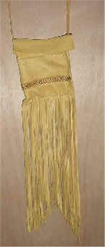 This Bag is made of buttery soft deer hide with adjustable shoulder strap. Has stitching detail. 5 1/2 x 5 in. Overall length of bag and fringe is 20".