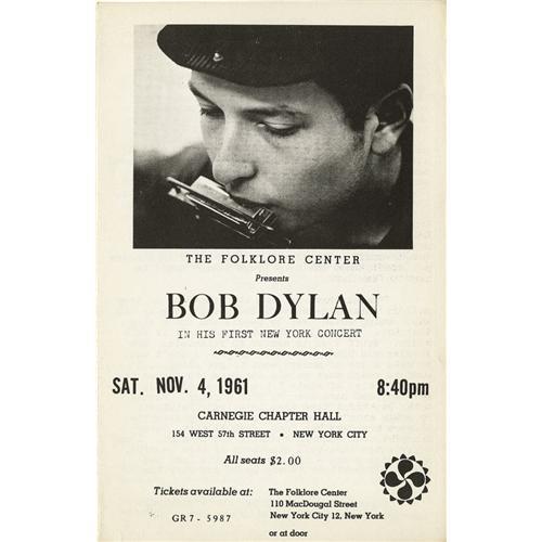 <B>Handbill for Bob Dylan's "First New York Concert."</B></I> Bob Dylan quit college at the end of his freshman year at the University of Minnesota in 1960, but stayed in Minneapolis and worked the folk circuit there, occasionally making jaunts to Denver and Chicago. In January 1961, en route to Minneapolis from Chicago, he changed course and went to New York City to perform, as well as to visit his ailing musical idol, Woody Guthrie. Playing mostly in coffeehouses for little pay, he gained some public recognition after a review by <I>New York Times</B></I> music critic Robert Shelton; that, combined with word-of-mouth around Greenwich Village led to contract with Columbia Records in October 1961. This handbill was printed to promote what was then touted as Dylan's "First New York Concert" on November 4, 1961, at the Carnegie Chapter Hall. In Excellent condition, with very minor wear and faint tanning around the edges.