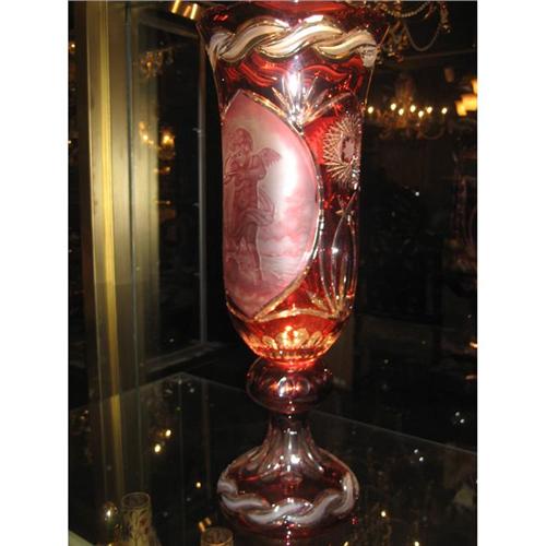 THIS AMAZING RED ETCHED CRSTAL VASE WOULD BE A FOCAL POINT IN ANY ROOM.