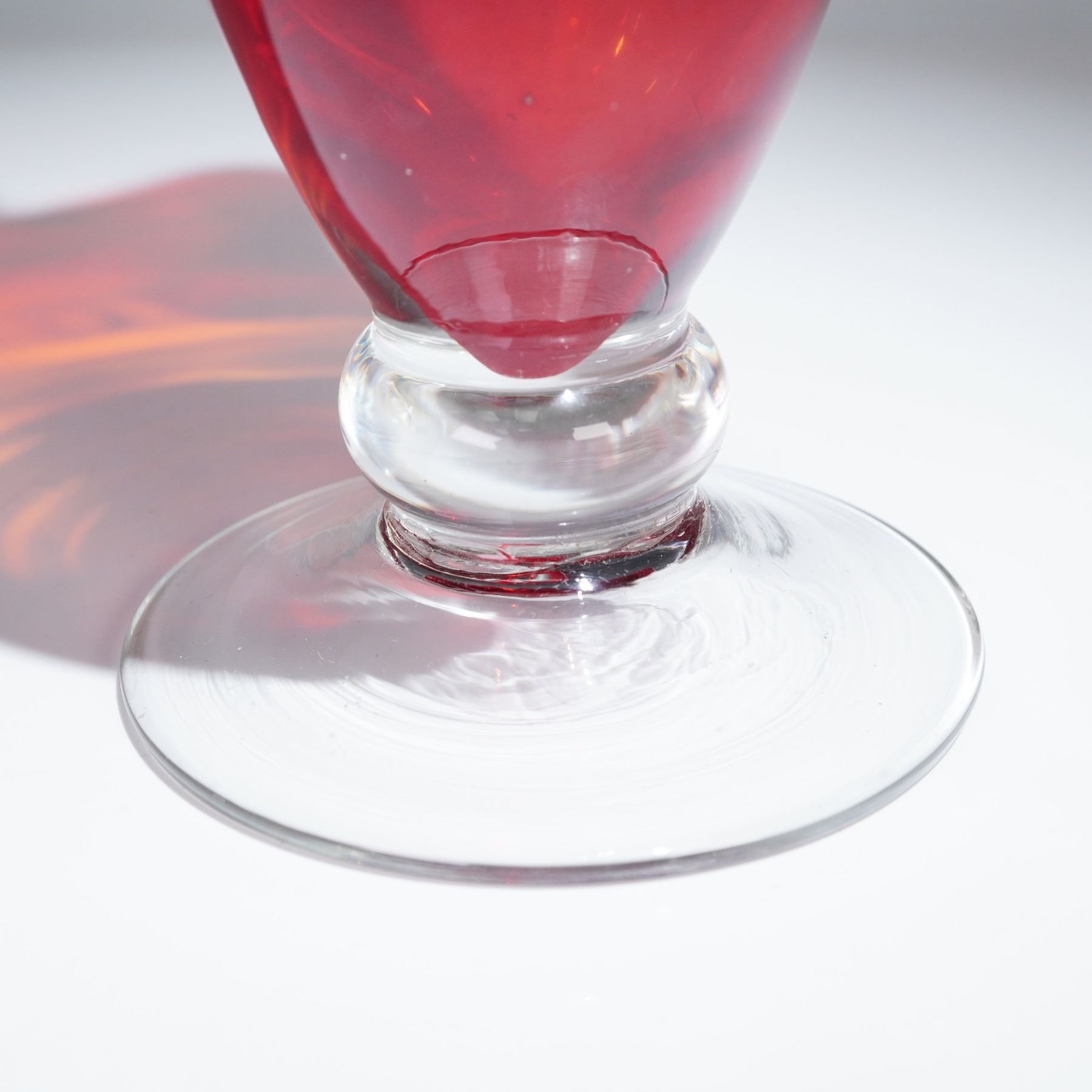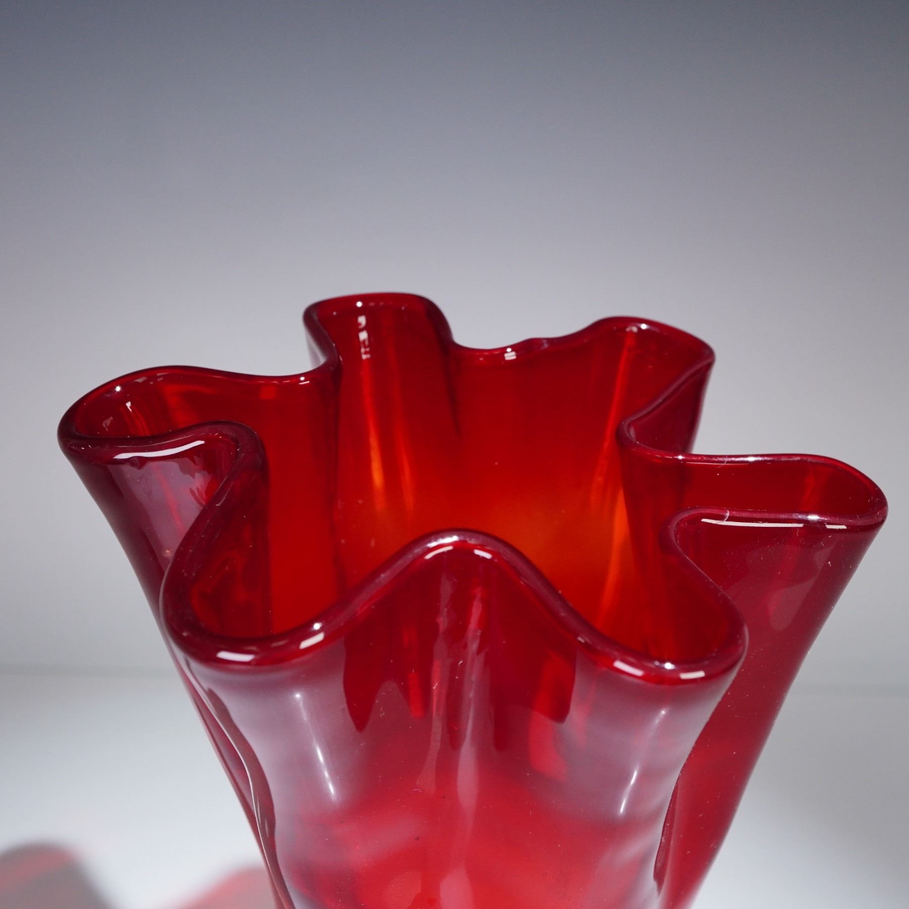 Vibrant handblown art glass vase in deep ruby red with an organically ruffled rim and clear applied foot. The body showcases subtle tonal variation and a sculptural flow that adds visual drama, while the polished pontil mark on the base indicates artisan studio craftsmanship. A striking standalone centerpiece or accent for art glass collectors.