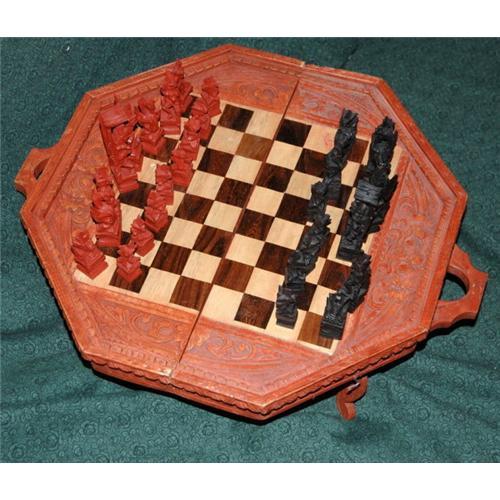 Very ornate hand carved wood chess table set from Bali. It is portable. The leg come off and go inside with the chess pieces. Then the table folds into a neat carrying case. The inside has a backgammon board. <p> I have seen this particular set sell for around 200 dollars new. The condition of my set is not new but in decent condition. One of the pieces is missing. It is the bishop. Some of the pieces have some dings. The table has some damage to to wood on the rim of one of the sides as shown in the picture. <p> Even with the imperfections it is a fabulous set and you can get it for a mere fraction of the going rate.