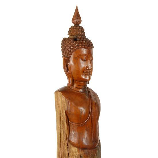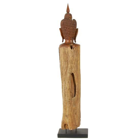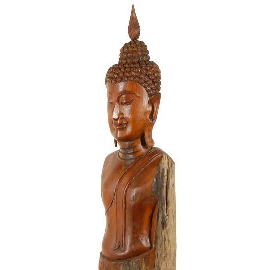 Finely hand carved Thai style Buddha carved on old teak log. Excellent pain-staking craftmandship. A truly one-of-a-kind piece for that special location in your gallery or home. Approximately 64" x 15" x 10". It is getting nearly impossible to get any old-growth teak out of Asia; do not miss your chance to own this piece. Invest in one-of-a-kind ART!
