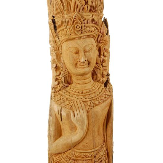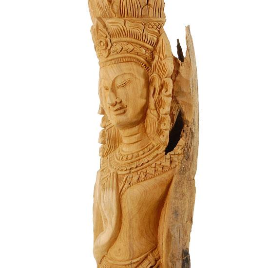 Finely hand carved Thai style Buddha carved on old teak log. Excellent pain-staking craftmandship. A truly one-of-a-kind piece for that special location in your gallery or home. Approximately ' tall and ' wide. It is getting nearly impossible to get any old-growth teak out of Asia; do not miss your chance to own this piece. Invest in one-of-a-kind ART! 60" x 15" x 8"