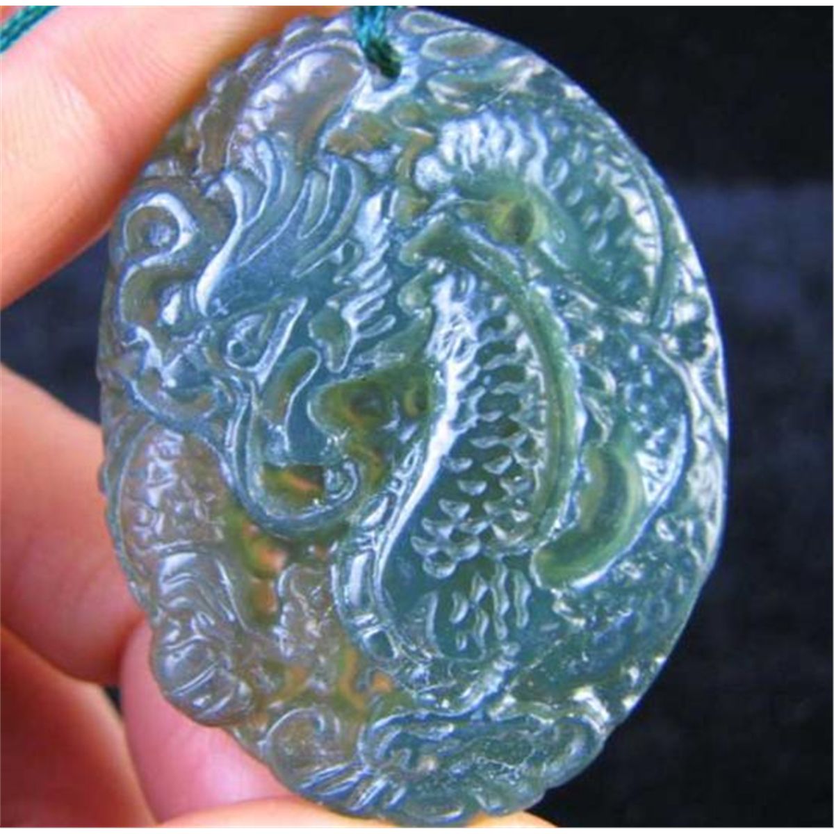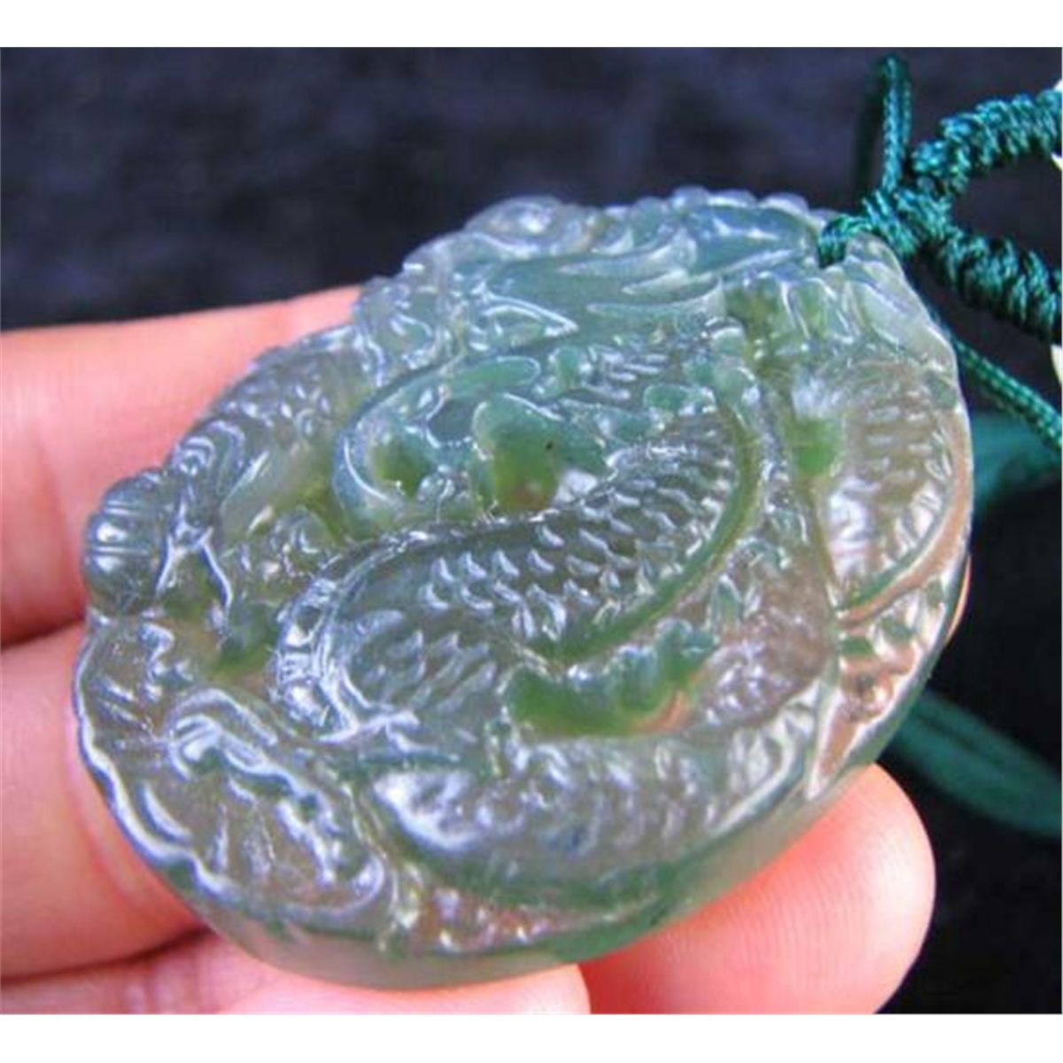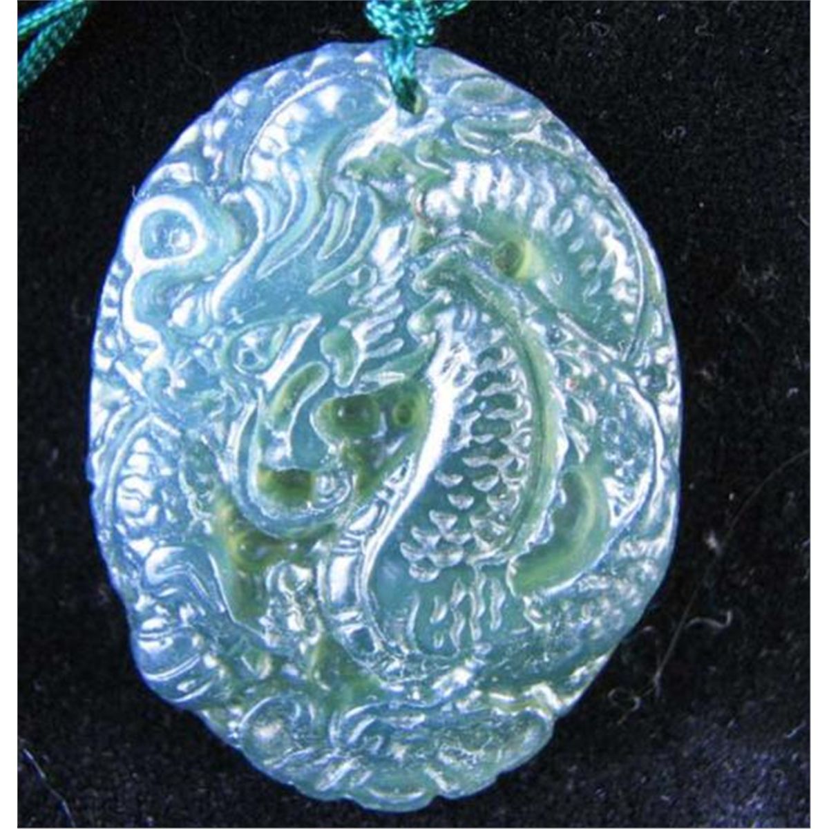 Handcarved Natural Transparent Green Jade pendant depicting a dragon. Measures approx 2 in x 1.5 in mwf2220