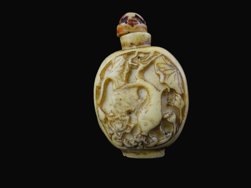 Handcarved Stone Snuff Bottle depicting koi fish, measures approx 2.5 inches high