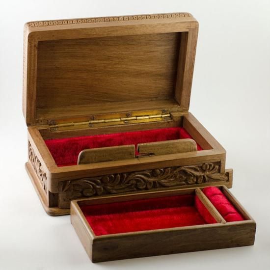 Handcarved Walnut Jewelry Box, Dimensions: 8in (L) X 5in (W) 3in (H)