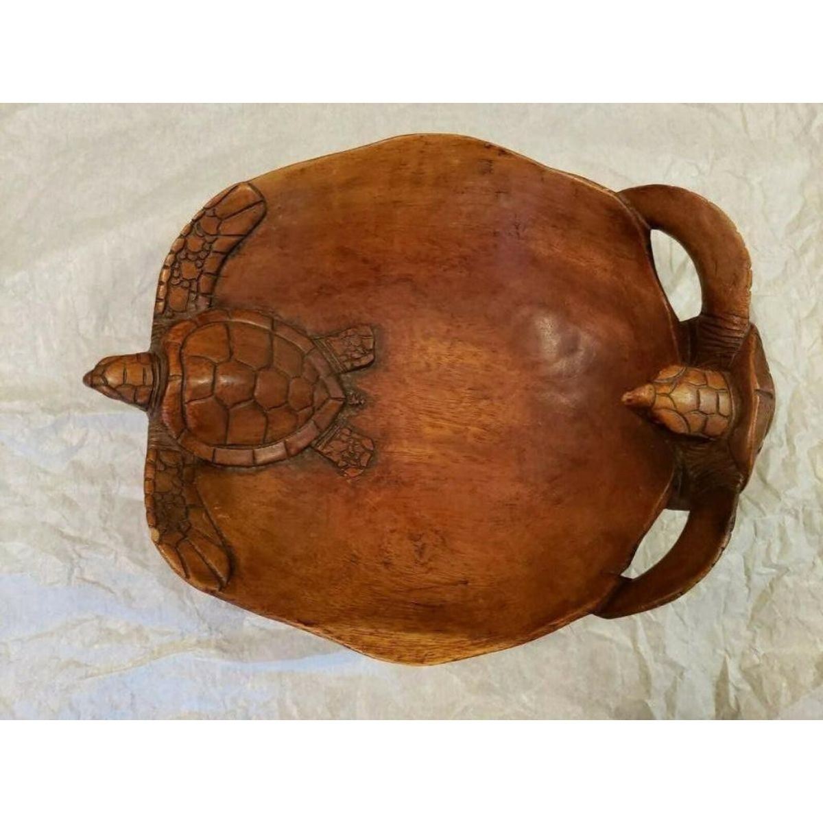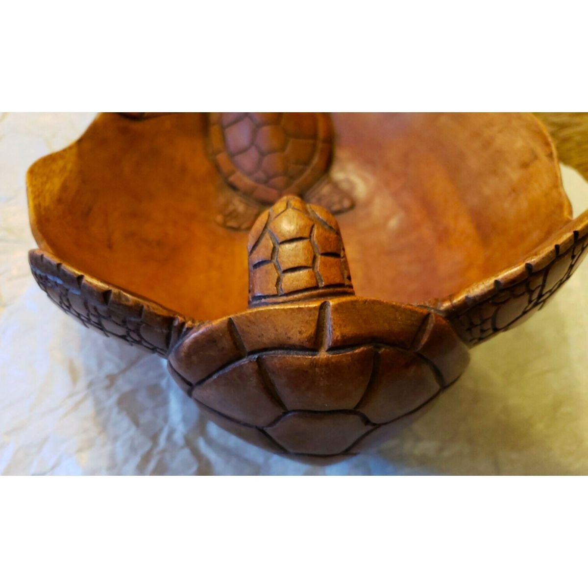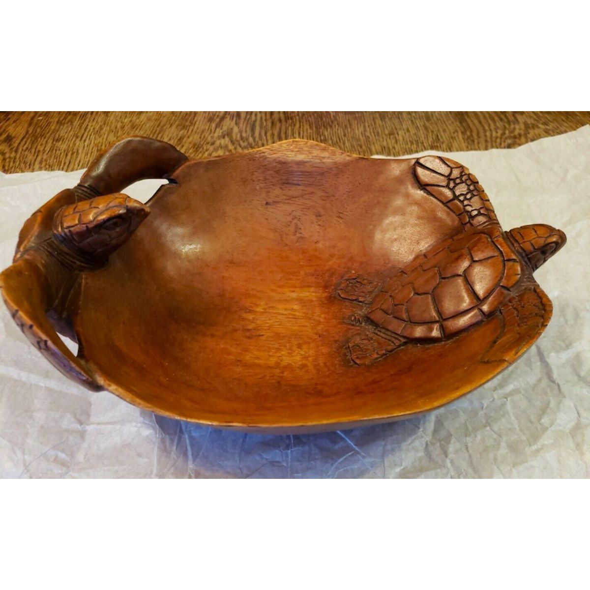 Hand-carved wooden bowl decorated with two sea turtles. 12" L X 9 1/2" W.Â