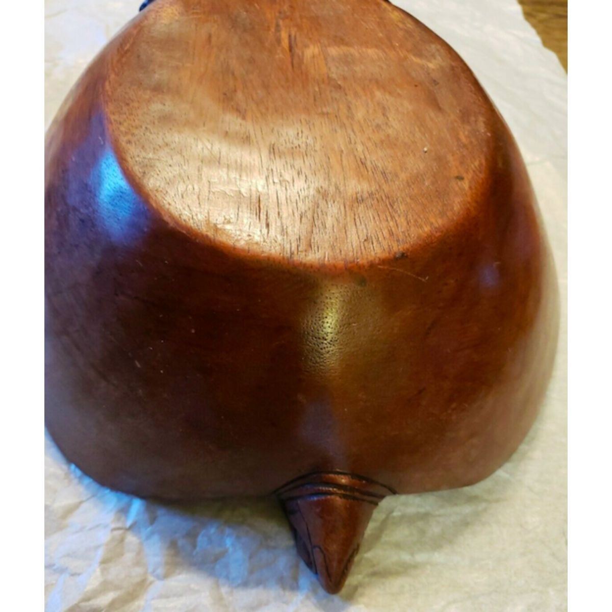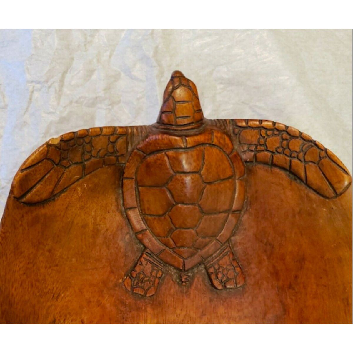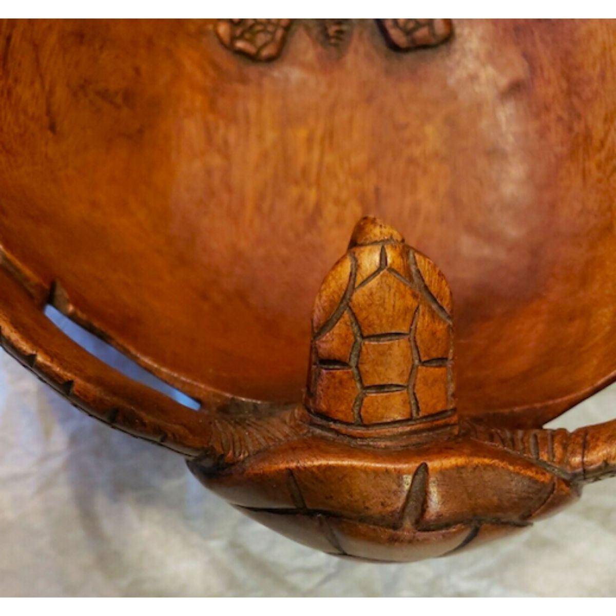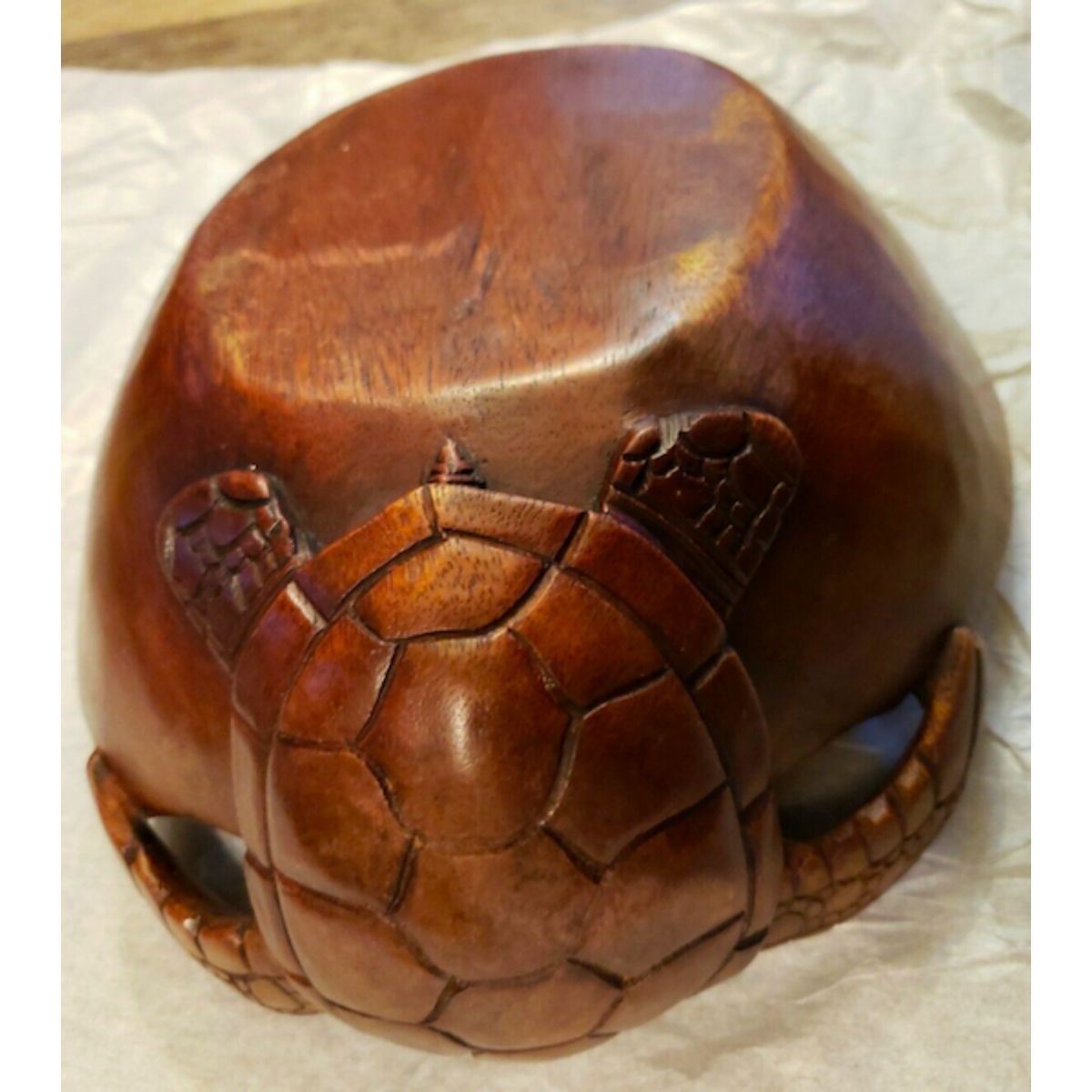 Hand-carved wooden bowl decorated with two sea turtles. 12" L X 9 1/2" W.Â