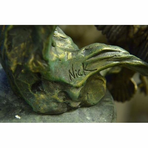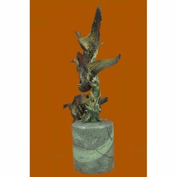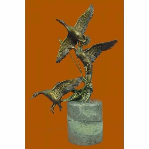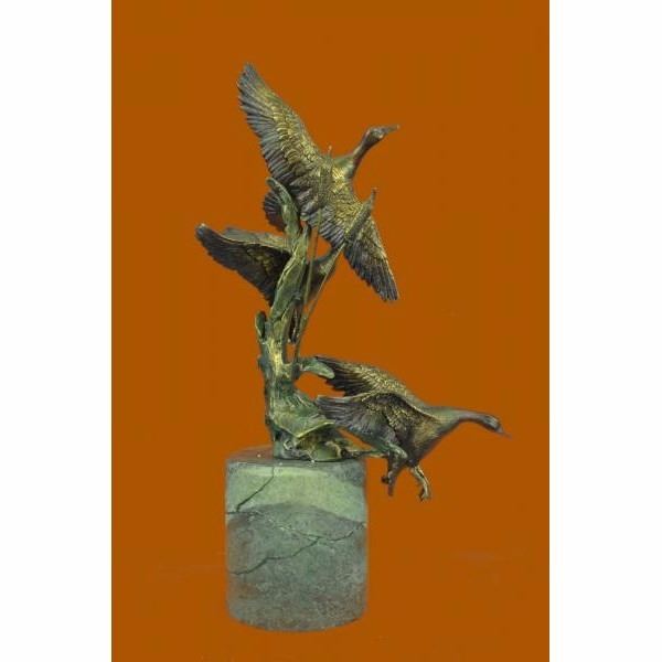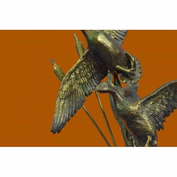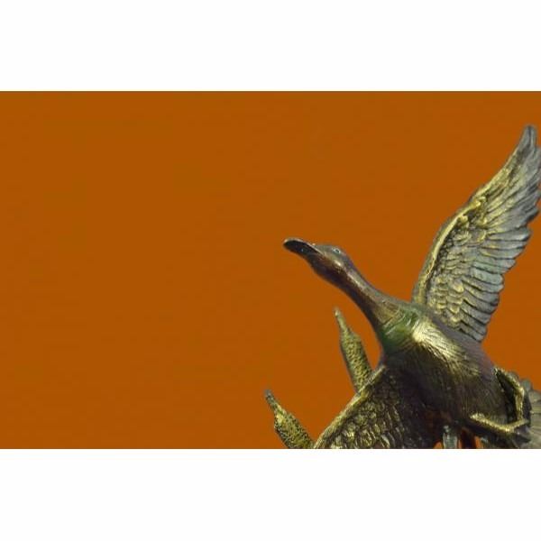 The Ducks beauty and their spectacular mating dances have made them highly symbolic birds in many cultures. Most have elaborate and noisy courting displays or "dances". According to folklore, cranes mate forlife and even those who do not, still stay mated to one partner for several decades. This everlasting bond is depicted in this sculpture of two Ducks spending a relaxing day in the marsh near an open stream. They stand side by side. One grazes, while the other looks out at their surroundings. It is a great gift for nature lovers, fisherman, hunters and country dwellers. It may even be a sweet gesture to a lovely devoted couple on their golden anniversary. 100% bronze and handmade, this brown patina sculpture was cast using the "Lost Wax Method" and mounted on a black marble base. It features the signature Nick. Condition : This sculpture is in perfect condition. Bronze Dimensions with Marble Base:Height 18" x Width 11.5" Marble Dimensions: Diameter 5" Height without base: 5" Weight : 16 LBS Inventory : 67AL3138376