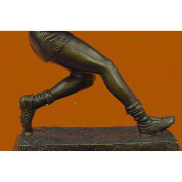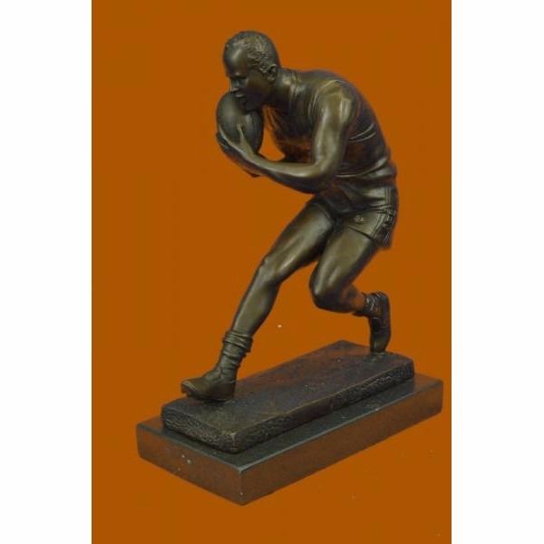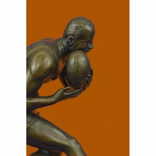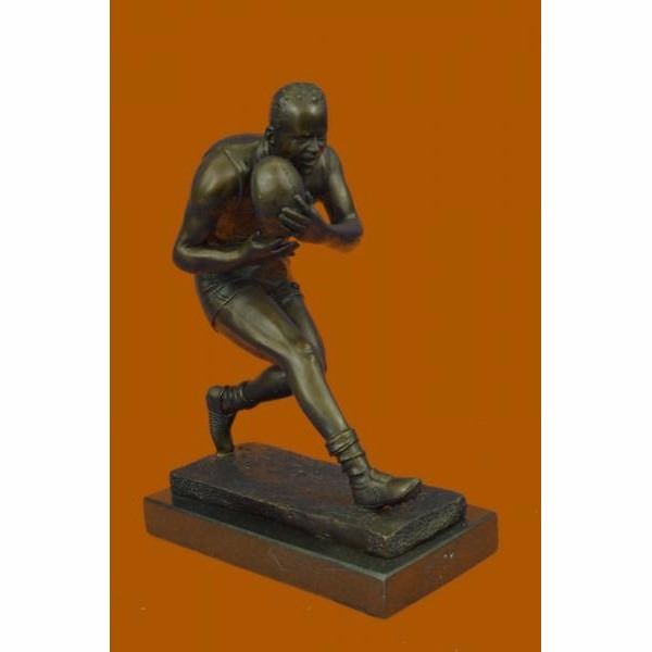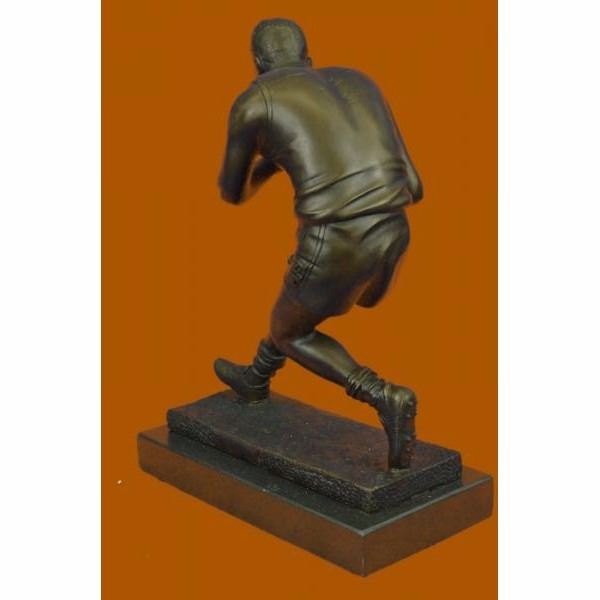 A muscular Rugby player runs for the end field, trying to skip the yards and avoid being tackled. His powerful legs ache as he sprints and dodges. He Kicking the ball under his protectively. Every once in a while he glances over his shoulder to see how close his opponents are. He eyes the white touch down line. He can hear another player barreling down on him. He glances to his teammate and prepares to hand the ball over, sacrificing himself for the win. 100% bronze and handmade, this brown patina sculpture was cast using the "Lost Wax Method" and mounted on a black marble base ad is signed Milo. Condition: This sculpture is in perfect condition. Bronze Dimensions with Marble Base:Height 12" x Width 8.5" Marble Dimensions: 8.5" X 5" . Height without base: 11" Weight : 11 LBS Inventory; 54YRD10555345