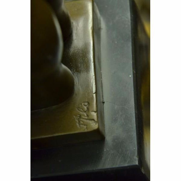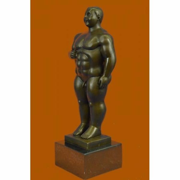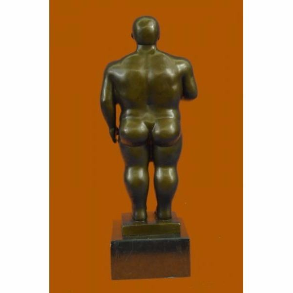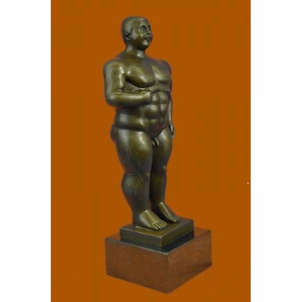 The curvyplumb manis ready to make his next move in her complex strip show. The composition recalls the Classical sense yet adopts a modern abstract flair that gives his body an added emphasis on his curvaceousness a tribute to Botero. He seems to coyly look up as if blushing due to the gushing admiration he gets from the beholder witnessing his body. The bronze sculpture was captured using the ancient method of lost-wax casting and finished with a brown patina stain for preservation. She is mounted upon a black marble base with the artist Milo's signature. Condition: This sculpture is in perfect condition. Bronze Dimensions with Marble Base:Height 13" x Width 4" Marble Dimensions: 4" x 4" Height without base: 11" Weight : 8 LBS Inventory : 45EPA0035154
