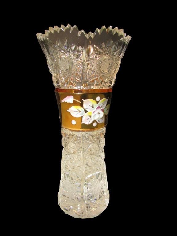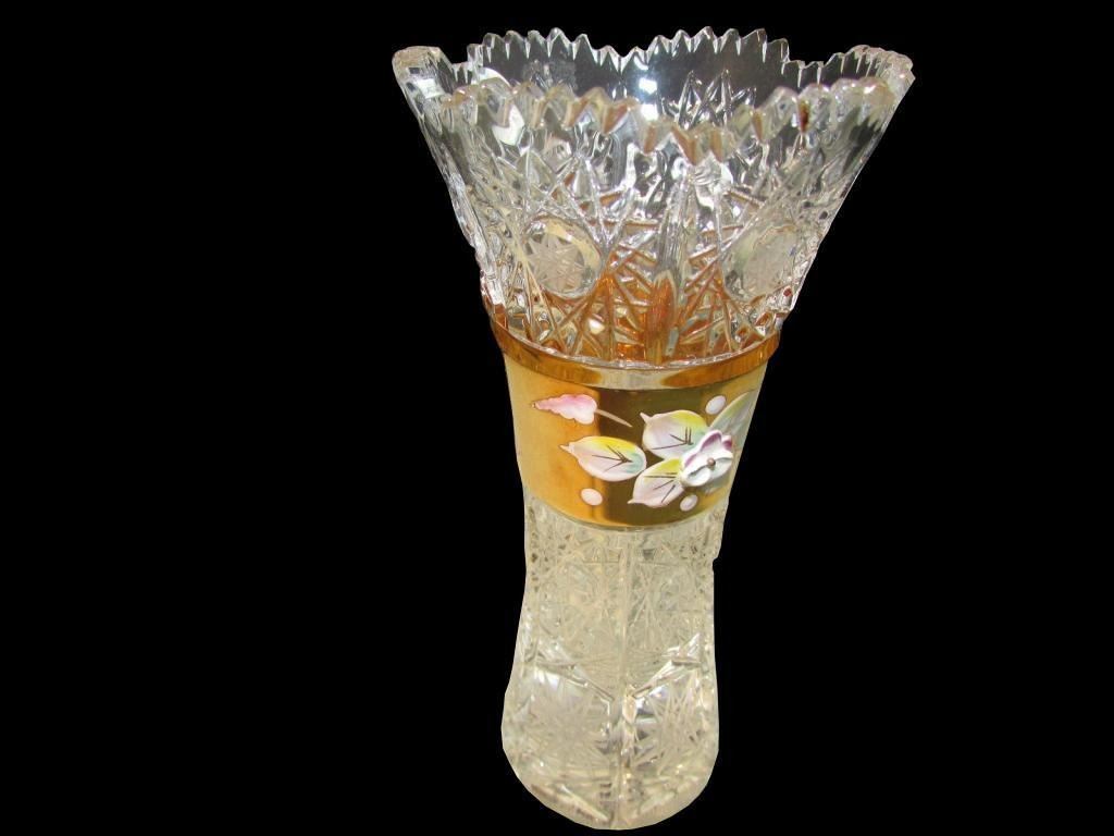Hand-cut Caesar crystal, high enamel floral pansy design with gold & a clear line of glass. Sticker that reads "Czech Republic" Height 6" - Rim Diameter 2 3/4 " - Base diameter 2". Hand crafted, blown & cut.