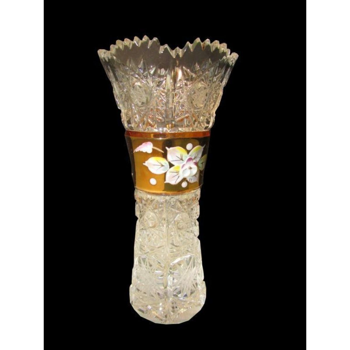 Hand-cut Caesar crystal, high enamel floral pansy design with gold & a clear line of glass. Sticker that reads "Czech Republic" Height 6" - Rim Diameter 2 3/4 " - Base diameter 2". Hand crafted, blown & cut.