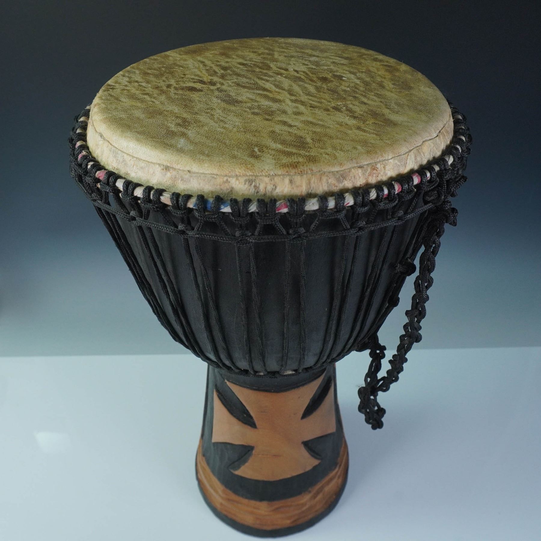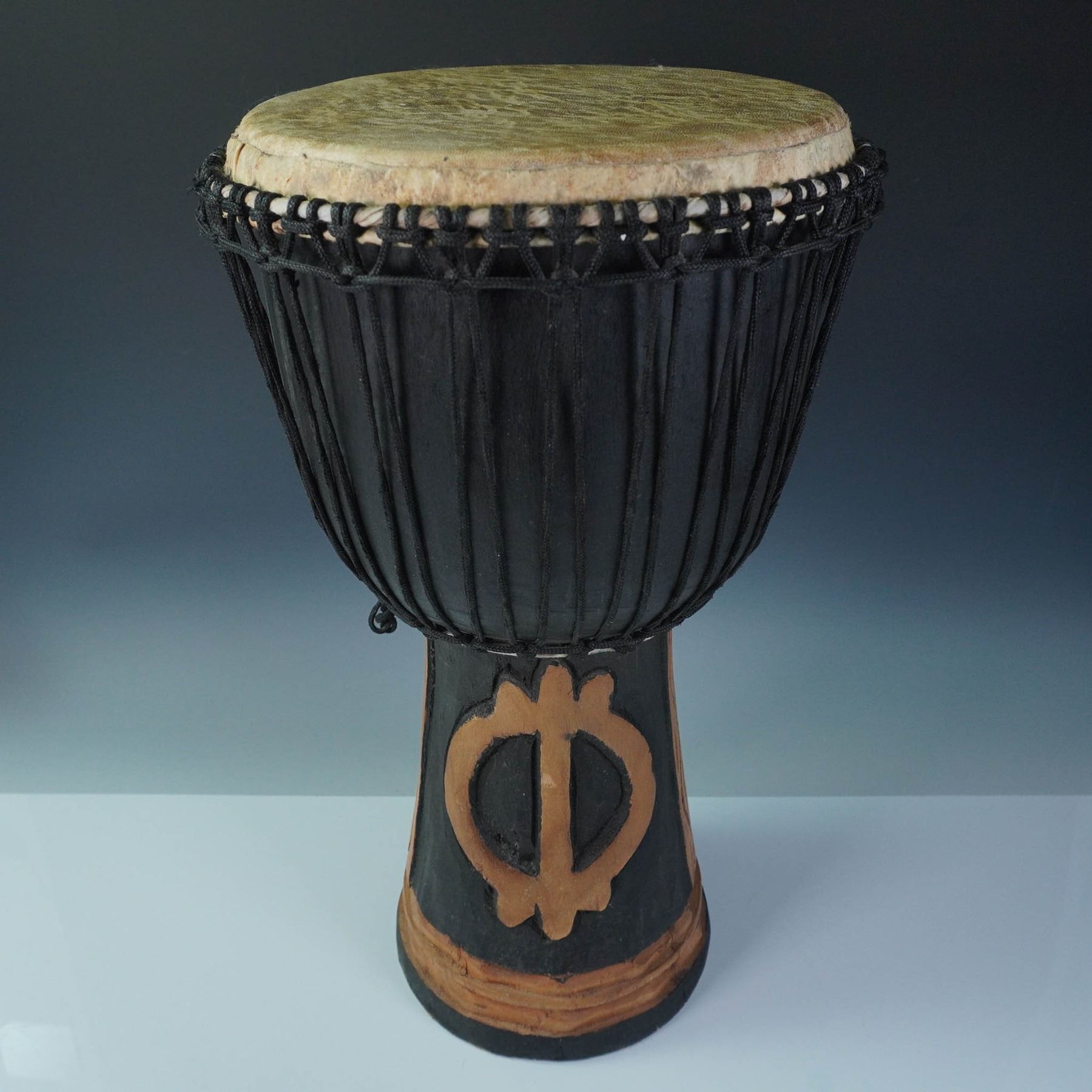 Traditional handcrafted djembe drum made in Ghana, featuring a goblet-shaped body carved from wood. The base is adorned with symbolic tribal-style carvings and natural variations in tone. The drumhead is made of natural hide, tensioned with black rope tuning, which is looped and knotted around the rim in traditional fashion. A paper label reading “Handcrafted in Ghana” is affixed to the interior. This type of drum is commonly used in West African music and ceremonial practices.
