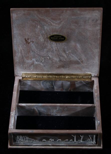 Offered in this lot we have a pair of handcrafted incolay stone jewelry boxes originating from the early to mid 20th century. The pair consist of one large and one smaller stone jewelry boxes. The first of the incolay boxes features the embossed image of big horn sheep with mountains in the background. The sides show embossed carvings of landscape scenes showing herds of deer or big horn sheep. The second box features the embossed image of birds sitting on the edges of a bowl with floral patterns across the top of the piece. The sides show embossed floral leave patterns. The pieces show a hinged top with a black velvet bottomed interior and stone partitions in the larger one. The jewelry boxes show a sticker reading "Genuine Incolay Stone Handcrafted U.S.A." in gold color lettering set onto the underside of the lid. The boxes show good condition overall, but could use some cleaning. The large box measures 7 1/2" wide by 6 1/2" long and 2 1/4" tall with the second jewelry box measures 4 1/2" wide by 4" long and 2 1/2" tall.