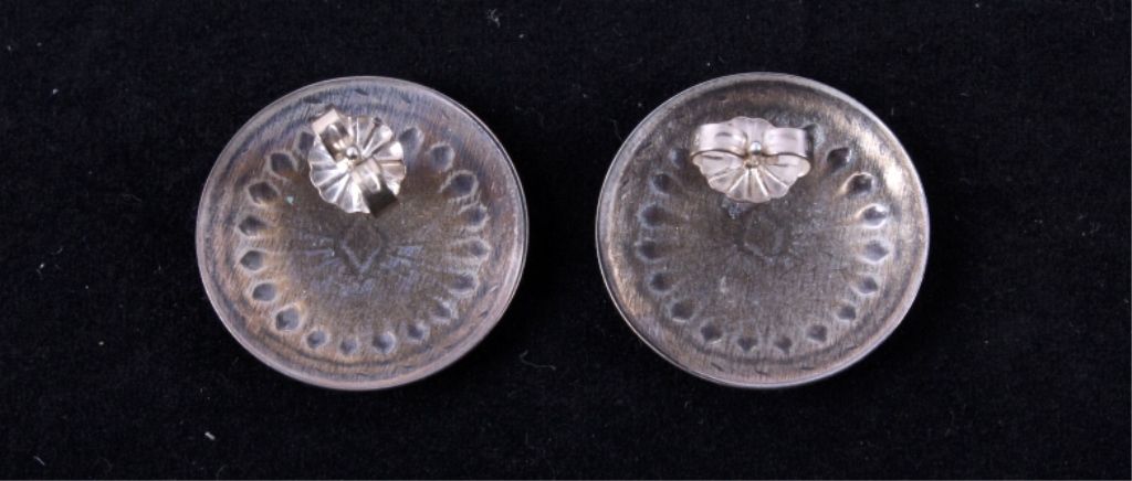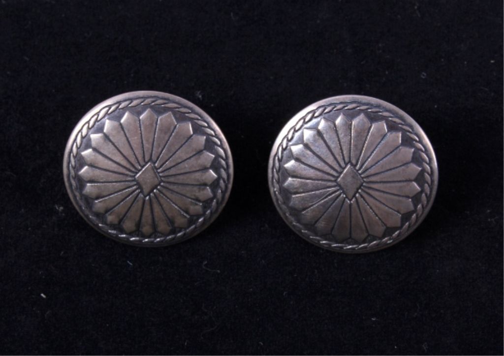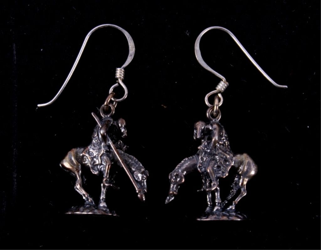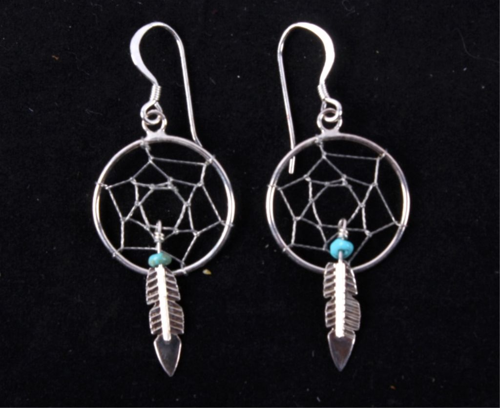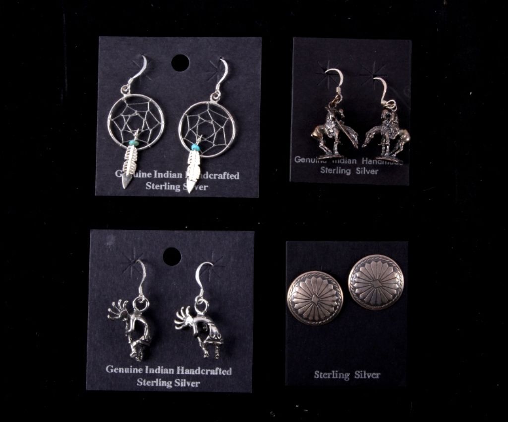 This lot contains four handcrafted Indian sterling silver earrings. All of which are in immaculate condition showing little wear. The dream catcher earrings are quite beautiful with attached sterling silverfeathers and turquoise bead measuring 2". The classic "End of the Trail" silhouette is a tremendous piece measuring 1.25" and the Native American with instrument is another unique set measuring 1.25". Lastly thesterling silver shield earrings are finely handcrafted and in great condition measuring 0.75" in diameter.