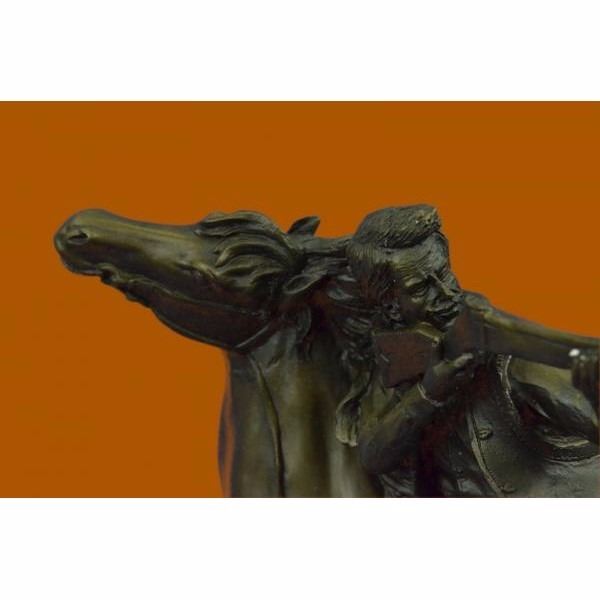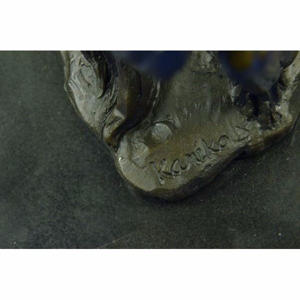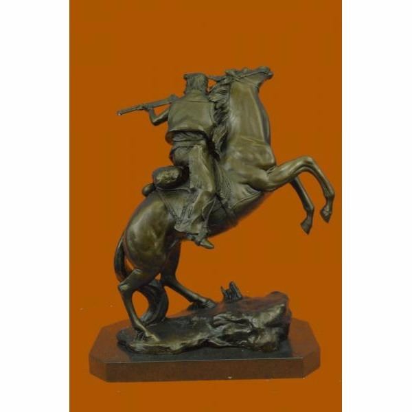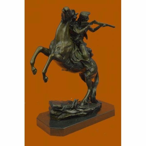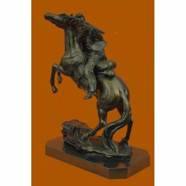 It's the Wild Wild West! This gunslinger, comfortable on his rearing horse, looks over the horse's neck to watch ahead for his enemy. He's ready to fire his weapon if need be as he travels hurriedly through the western lands. The American Cowboy has been depicted and famed for decades films, television and literature. The wonderful sculpture here pays tribute to this fascinating time in history. It was crafted using the lost wax method. The piece rests on a black marble base. It is signed by the artist Kamiko. Condition :This sculpture is in perfect condition. Bronze Dimensions with Marble Base:Height 15" x Width 12" Marble Dimensions: 12" X 6". Height without base: 14" Weight : 22 LBS Inventory : 80YDW21712008