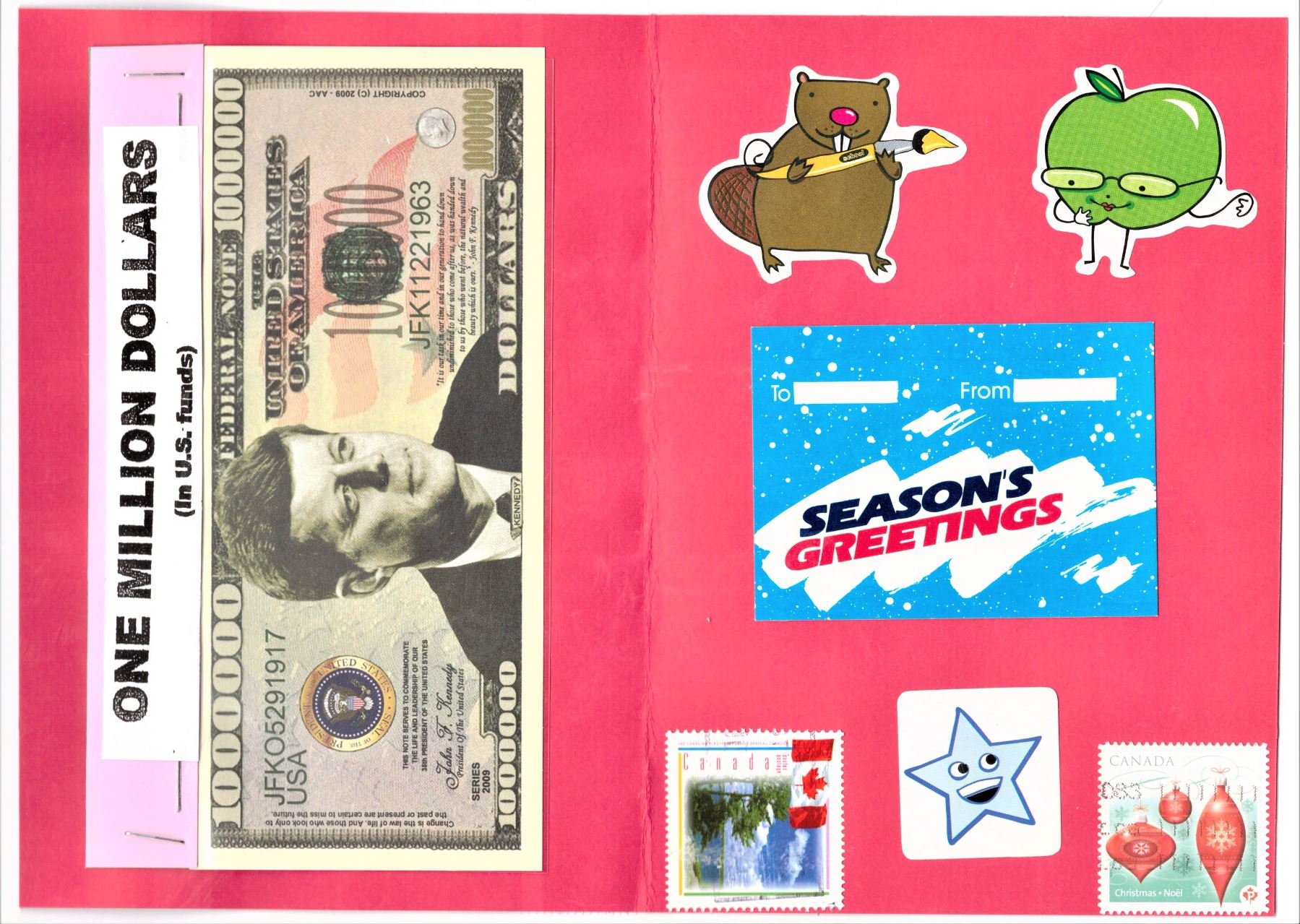 Each card has more than 30 real stamps on the front and a famous person million dollar bank note inside.