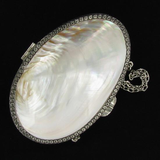 Well crafted new mother of pearl one piece evening bag; shell 7.5"; chain 48"