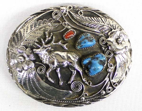 Handcrafted SSI Western Elk Belt Buckle, Embellished with Turquoise and Coral, made in the USA, nice heavy piece