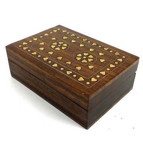 Handcrafted Sheesham Wood and Inlaid Brass Hearts Box - **|**|** Delicate vines and hearts of inlaid brass accent this carved box with hinged lid #IWB003-554302